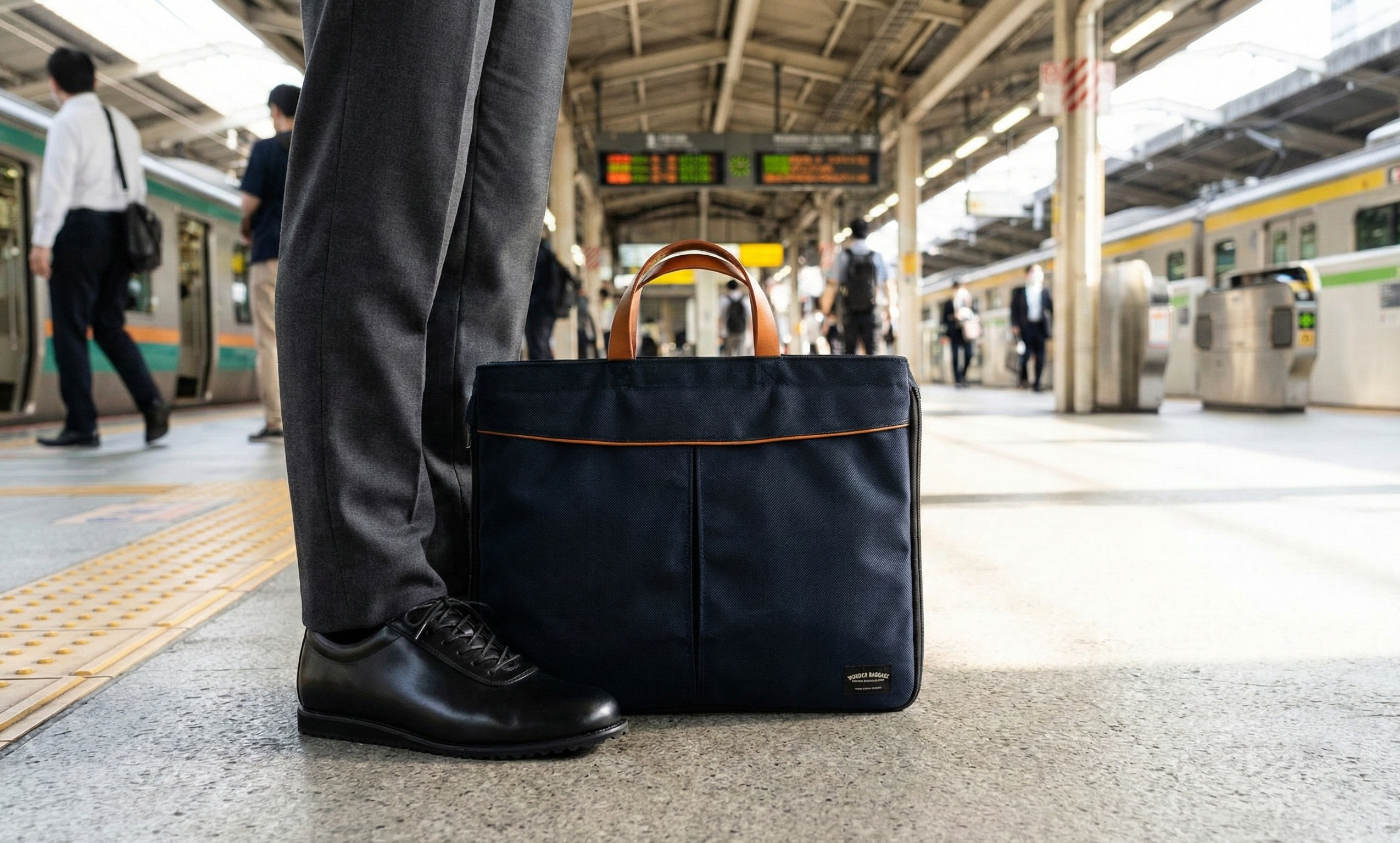 堅実な印象。通勤のスタンダード。高強度ナイロンのバッグにマルコの革靴を合わせれば、信頼感のある足回りが完成する。