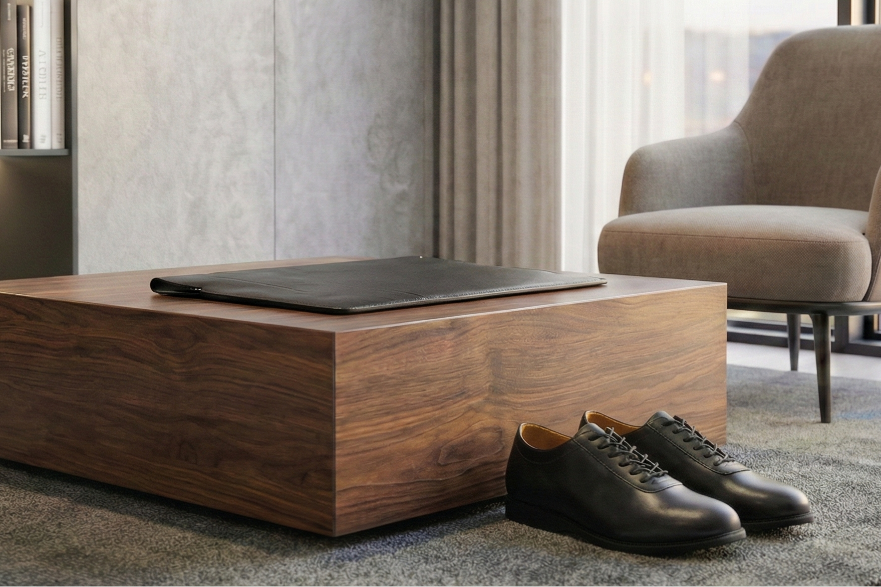 貫禄のある印象。ここぞの日に。ブッテーロのPCスリーブにマルコの革靴。すべてをレザーで統一する潔さが、静かな自信を伝える。